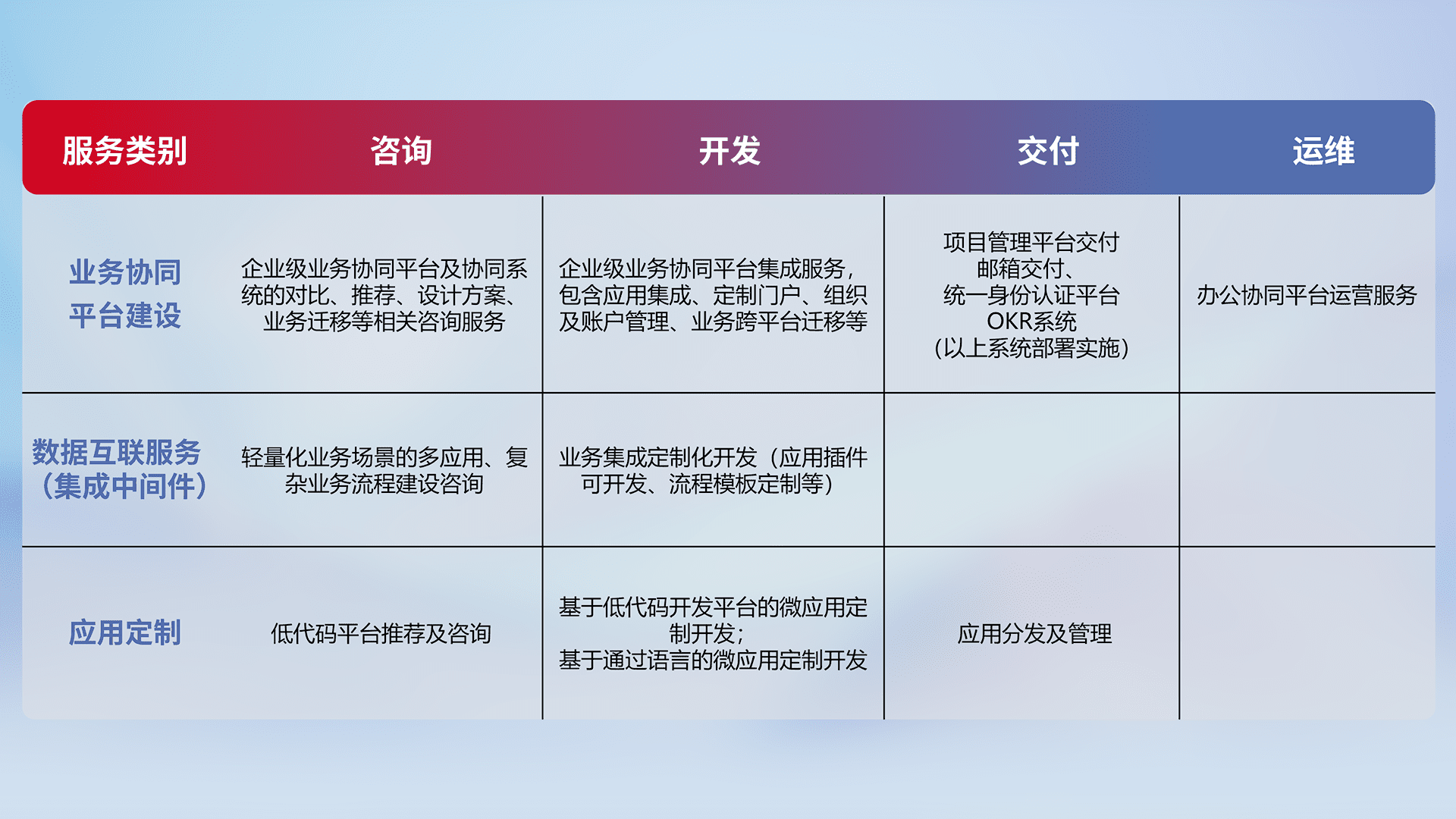 针对钉钉、、企微、、、、IDaas等平台级产品提供产品的规划、、、、方案、、、交付、、、、定制化开发等服务,,,,实现如统一协同办公、、智能客户服务、、、、混合会议管理、、智能数据查询、、等业务场景,,实现数字化转型。。。。
